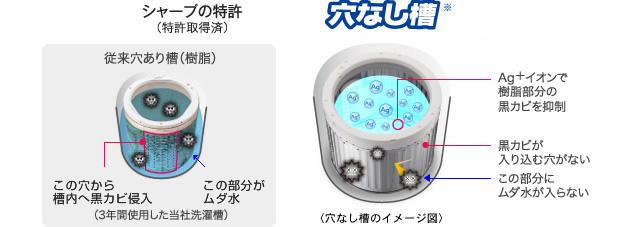 穴がないことで洗濯槽の外側に発生する黒カビを抑えることができます。