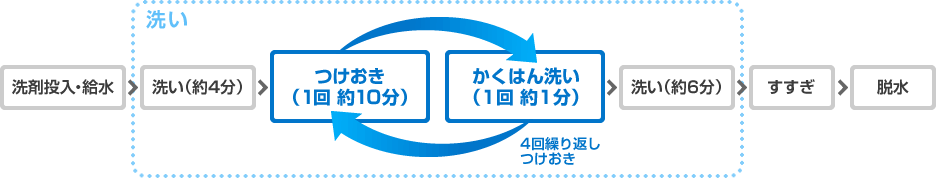 洗剤液に衣類をひたす「つけおき」と「かくはん洗い」を4回繰り返して汚れを溶かし出し、しっかり洗浄します。これで汚れを手軽にキレイに落とせます。