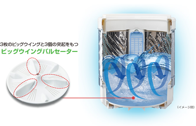 水平・垂直方向にパワフルな立体水流を起こし、水や衣類をしっかりかくはん。
