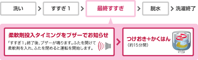 最終すすぎの途中で、柔軟剤を入れるタイミングをブザーでお知らせ。