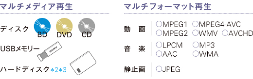 ブルーレイディスクのみならずDVDやCDはもちろん、USBメモリーや外付けハードディスクに保存された動画・画像・音楽などもお楽しみいただけます。