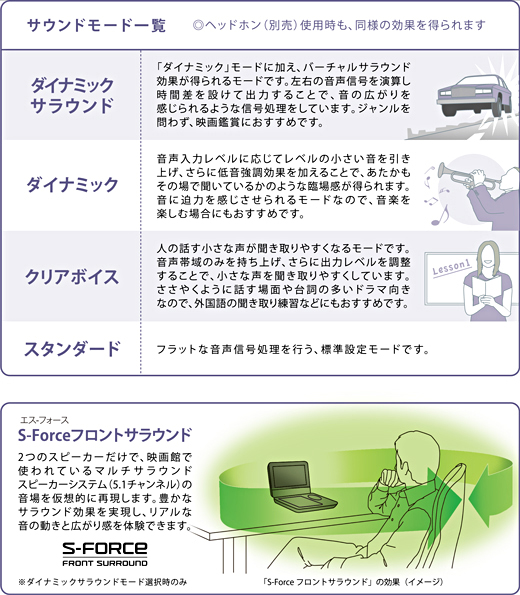 専用のオーディオDSP(デジタルシグナルプロセッサ)を搭載し、まるで包みこまれるような広がりのある「ダイナミックサラウンド」など、4つのサウンドモードを用意。