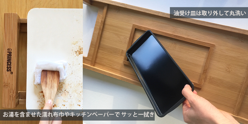 使用後のお手入れはプレートを少し冷ましてからお湯や水で湿らせたキッチンペーパーや布でサッと一拭きで簡単に落とせます。