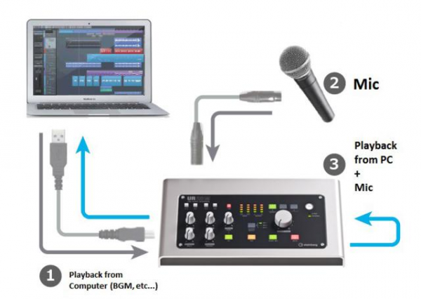 インターネットの動画配信などに便利な機能です。UR の入力端子に入力されているオーディオ信号(ライン、ギター、マイクなど)と、Cubase など DAW ソフトウェアから再生されているオーディオ信号を UR 内部で2チャンネルにミックスし、コンピューターに送り返すことで、ストリーミングソフトウェアなどを通じたインターネット配信が可能です。