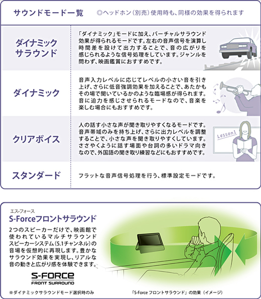 本体前面に付いた2つのスピーカーだけで、仮想的に5.1チャンネルを再現するS-Forceフロントサラウンドを搭載。奥行感のある音により、さらにコンテンツをお楽しみいただけます。