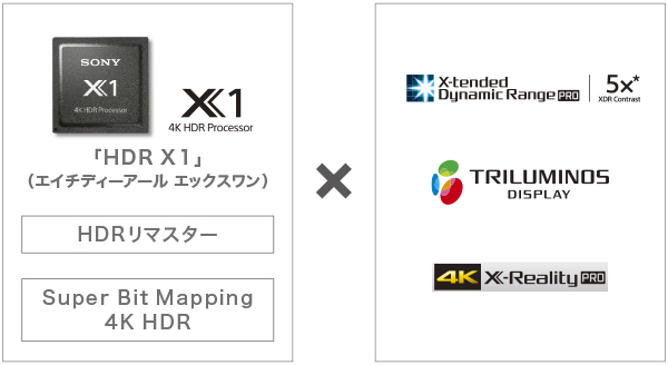 4Kの美しさを最大限に高める4K高画質プロセッサー「HDR X1(エイチディーアール エックスワン)」を搭載。画質の3大要素である精細感、色の鮮やかさ、コントラストを向上させるそれぞれの高画質機能をより細かくコントロールします。さらに、さまざまな映像を高コントラストなHDR相当の画質でリアルに描く「HDRリマスター」、豊かな階調表現でなめらかな色表現を実現する「Super Bit Mapping 4K HDR」が映像の美しさを高めます。