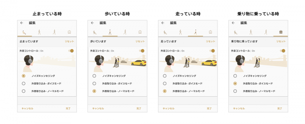 ユーザーの行動に合わせて、あらかじめ各パターンで設定しておいたノイズキャンセリングや外音取り込みのモードに自動で切り替えてくれます。音楽を聞いているシーンに応じてヘッドホンが自動でモードを切り替えてくれるので、自分で設定を切り替える必要がなく、非常に快適に音楽を聴くことができます。