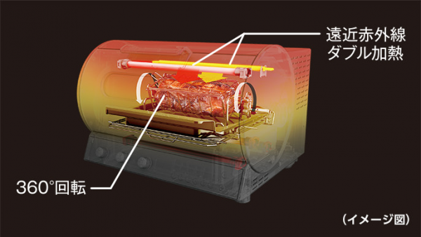 遠近赤外線ダブル加熱、低速回転機構、温度制御の3つのテクノロジーで、約600gのかたまり肉をしっかり、じっくり、丁寧に焼き上げ。肉のたんぱく質の凝集を抑えられるので、柔らかくジューシーに仕上がり、「肉が硬くなる」「均一に焼けない」という不満を解消します。
