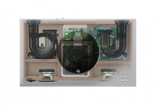 音響的効果までも採り入れた美しいデザインのボディは、内部にウッドボックスを持ち、合計5つのスピーカーユニットを配置しています。ハイレゾ音源に対応する50kHzに及ぶ超高域を実現する2cmツィーター、8cmウーハーユニット、力強く豊かな低音を再現する12cmサブウーハーユニットは、すべて専用に開発された高性能ユニットを採用。さらに、一体型ながらも豊かな広がりのあるステレオ音場を再現するため、音響レンズを新たに開発して搭載しました。一体型の常識を打ち破るスケール感と力強いサウンドを追求しています。